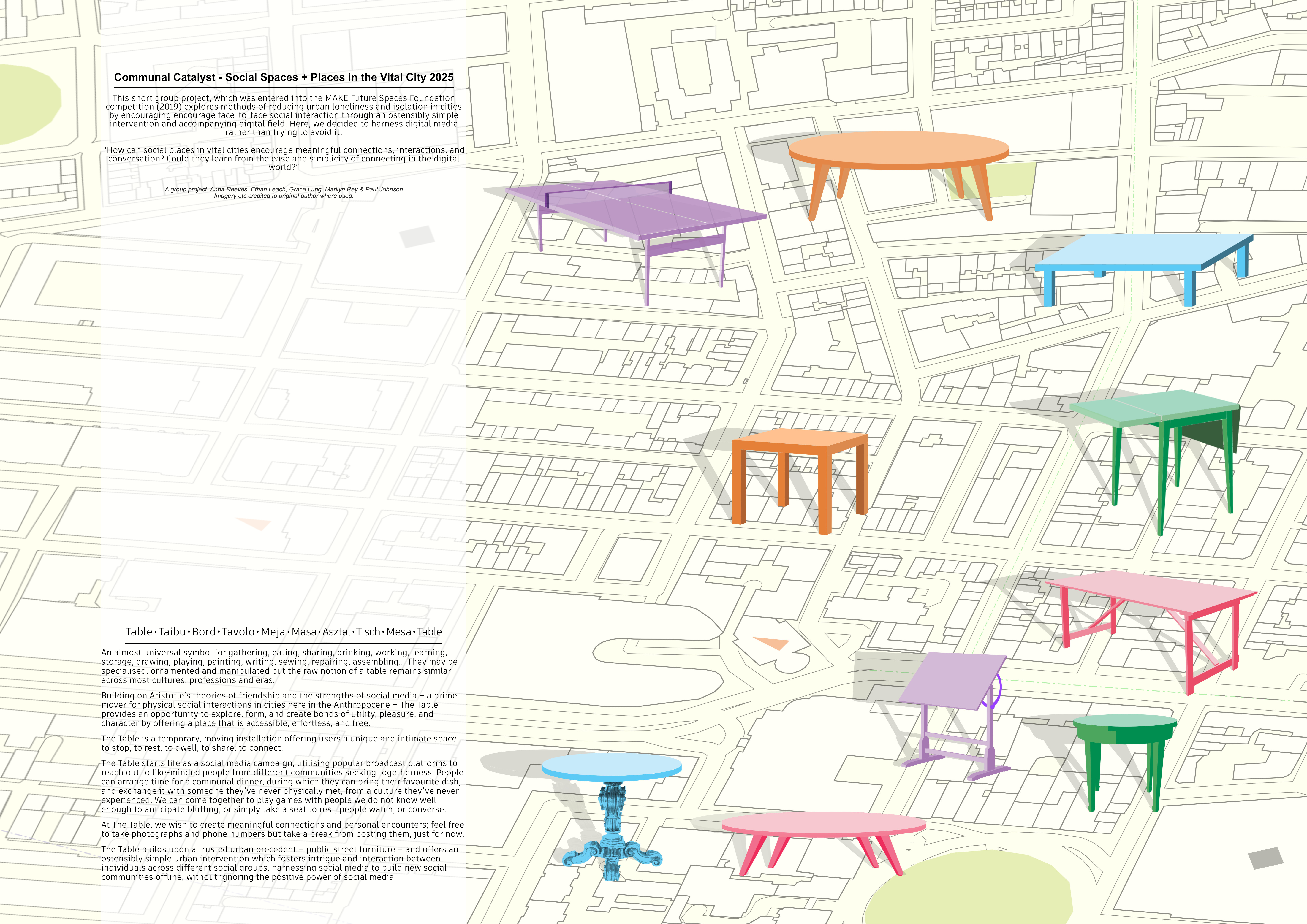 The Table was a four-week intensive group project to be entered into an in-school competition; two winning teams would then be entered into the Future Spaces Foundation's 2019 Student Design Competition "Social Places vs Social Media".
